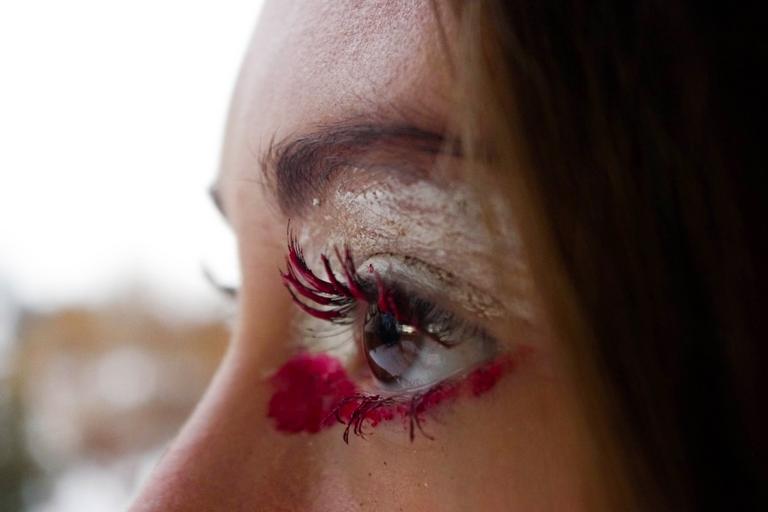 Keywords: macro eye girl paint photoshoot brown eyes close up bright eyes red white brown model eye hair make-up bright female