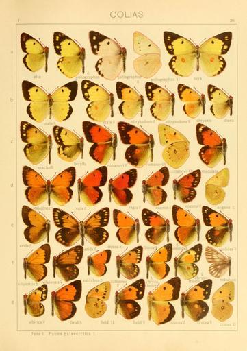 Keywords: Macrolepidoptera01seitz 0059.jpg Plate from Seitz A Ed 1900-1909 Die Großschmetterlinge der Erde Verlag Alfred Kernen Stuttgart Die Großschmetterlinge des palaearktischen Faunengebietes The Macrolepidoptera of the world a systematic account of all the known Macrolepidoptera Band 1 Abt 1 Die Großschmetterlinge des palaearktischen Faunengebietes Die palaearktischen Tagfalter https //archive org/details/diegrossschmette01seit read text in German See The Global Lepidoptera Names Index for valid names Colias hyale alta Staudinger 1886 Colias erate poliographus Motschulsky 1860 hera Grum-Grshimailo synonym for Colias erate Colias erate Esper 1805 chrysodona Boisduval synonym for Colias erate chryseis Röber synonym for Colias erate Colias erate f diana Röber 1906 Colias erschoffi Alphéraky 1881 Colias berylla Fawcett 1904 Colias romanovi Grum-Grshimailo 1885 Colias romanovi ab maculata Colias staudingeri Alphéraky 1881 Colias regia Grum-Grshimailo 1887 Colias eogene C Felder 1865 Colias arida Alferaki 1889 Colias thisoa Ménétriés 1832 Colias thisoa aeolides Grum-Grshimailo 1890 Colias viluiensis Ménétries 1859 Colias hecla sulitelma Aurivillius 1890 Colias chrysotheme Esper 1781 Colias nebulosa Oberthür 1894 sibirica synonym for Colias heos Herbst 1792 Colias fieldii Ménétriés 1855 Colias croceus Geoffroy 1785 http //www archive org/details/macrolepidoptera01seitz 1906 Creator Adalbert Seitz Author died more than 70 years ago - public domain PD-old The Macrolepidoptera of the World Fauna Palearctica Coliadinae Colias hyale Colias erate Colias erschoffi Colias berylla Colias romanovi Colias staudingeri Colias regia Colias eogene Colias arida Colias thisoa Colias viluiensis Colias hecla Colias chrysotheme Colias nebulosa Colias heos Colias fieldii Colias croceus |