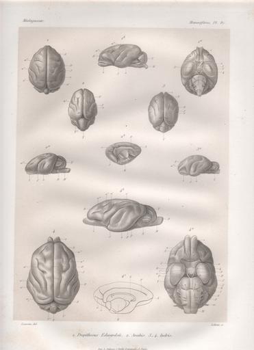 Keywords: Madagascar Mammiferes Pl 87.jpg de historische Darstellung der Anatomie der Gehirne eines 1 Edwards-Sifaka Propithecus edwardsi 2 Wollmakis Avahi und 3 + 4 Indriartigen Indriidae im Vergleich Source Louveau 51 183 Propithecus edwardsi Propithecus anatomy Primate brain Mammal brain comparisons |