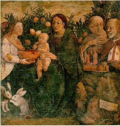| Keywords: Madonna col Bambino i Santi Francesco e Quirino.jpg Madonna col Bambino i Santi Francesco e Quirino Affresco attribuito a Antonio Allegri con i Santi che tengono in mano la città di Correggio Affresco trasportato su tela cm 112 x 94 1507-11 Modena Galleria Estense Foto Manzotti E' tradizione che l'affresco sia stato eseguito per l'antica chiesa di San Quirino annessa al castello dei da Correggio In occasione dell'abbattimento di detta chiesa nel 1514 il dipinto venne salvato con l'intero pezzo di muro retrostante e portato in Santa Maria della Misericordia Le successive vicende lo hanno collocato presso la Galleria Estense trasferito su tela dove attualmente giace nei depositi Si tratta di una delle prime opere documentate dell'Allegri eseguita forse nel 1507 come suggerisce il Quintavalle e rifinita nel 1511 secondo la data che appare in basso a destra Risulta evidente il momento mantegnesco del giovane pittore sottolineato da una notevole libertà e freschezza Non compaiono i vincoli architettonici la Madonna e i Santi conversano spontaneamente in un giardino signorile presso una siepe di cedri mentre i conigli mimano un incontro effusivo L'opera è molto legata alla città natale Il giardino è probabilmente quello dei Conti; i due santi sono i più amati dai correggesi; e San Quirino di cui la dinastia locale sta rinnovando il culto regge una esplicita dedicatio urbis ovvero l'immagine della città offertagli in protezione Quest'ultimo elemento oltre ad essere un prezioso documento urbanistico ci tramanda il segno della ascesa di Correggio al ruolo di vera piccola capitale own Icco80 Paintings of Francis of Assisi Saint Quirinus of Sescia Paintings in the Galleria estense Modena |