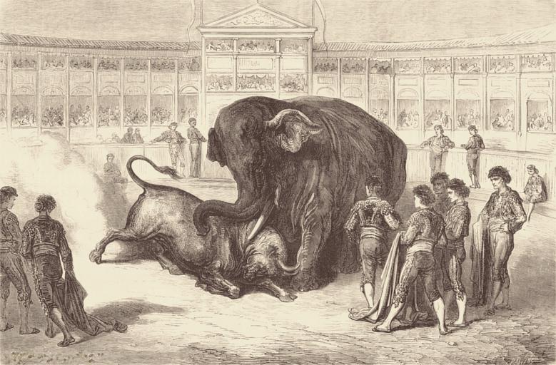| Keywords: Madrid 1863 Gustave Dore.jpg es Combate entre un toro y un elefante para L'Espagne 1862-3 de Charles Davillier File Madrid 1865 LMI jpg Le Monde Illustré Creator Gustave Doré 1860s PD-old-100-1923 Derivative versions Engravings of elephants 1862 Le Monde Illustré La Tauromachie de Gustave Doré Engravings of Madrid 1862 in Madrid Engravings of bullfighting Plaza de toros de la Puerta de Alcalá | ||||