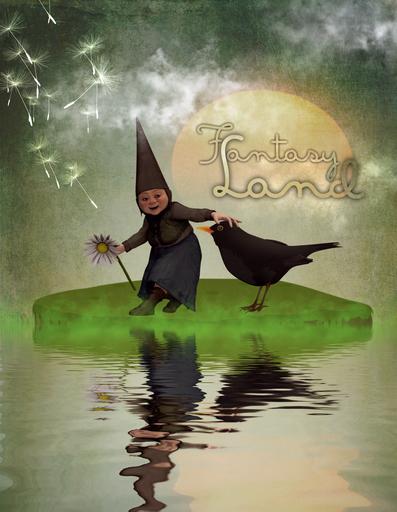 Keywords: magic dwarf blackbird water mirroring sun clouds sky dandelion geese flower rush meadow island friendship fairy tales fantasy nature bird animal world pond bank animal black garden flora close flower