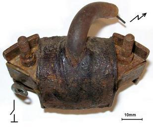 Keywords: Magnetzuend.jpg en Magneto ingnition coil; left termination for the contact breaker thick insulated cable for connection to the spark plug The third terminal of the tapped coil is the ground it is connected with the iron core de Zündspule einer Hochspannungs-Magnetzündung links der Anschluss für den Unterbrecherkontakt rechts oben derjenige für die Zündkerze Der dritte Anschluss der geteilten Spule ist mit Masse/dem Eisenkern verbunden own Ulfbastel 2009-07-21 PD Magnetos ignition Ignition coils White background |
