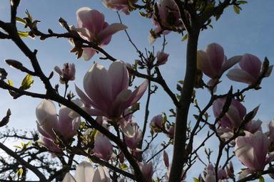 Keywords: magnolia bush flowers pink purple sky