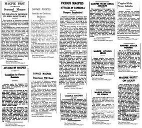 Keywords: Magpie attacks bush capital 1934-1952.jpg from the http //www nla gov au/ndp/ National Library Australian newspapers digitisation program which are pre-1955 so no copyright The service includes newspapers published in each state and territory from the 1800s to the mid-1950s when copyright applies http //www nla gov au/ndp/ National Library Australian newspapers digitisation program 1934-1952 Canberra Times PD-Australia Australian Magpies in art National Library of Australia - Australian Newspapers Service |