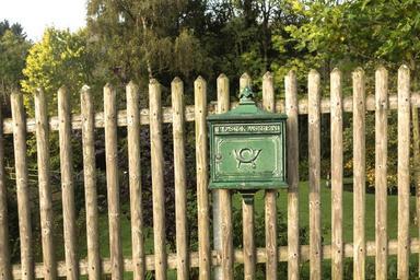 Keywords: mailbox fence wood fence post paling metal letters postman