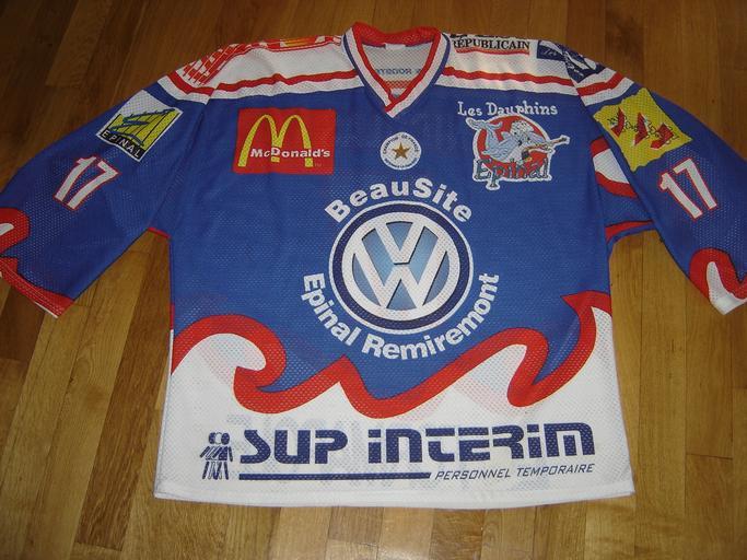 Keywords: Maillot des dauphin d epinal magnus.JPG maillot des dauphins d epinal pour leurs retour en ligue magnus en 2004 plus haut championnat francais 2007-02-21 own assumed Marmotte17 Dauphins d ™Ă‰pinal Ice hockey jerseys