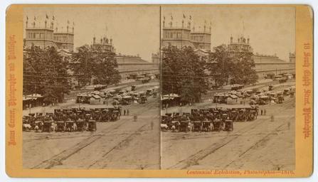 | Keywords: transportation james cremer jamescremer library company of philadelphia librarycompanyofphiladelphia centennial exhibition centennialexhibition stereographs philadelphia main building mainbuilding photo border Shows the Main Building and a nearby transportation center on the grounds of the Centennial Exhibition of 1876 in Philadelphia, Pa. The Main Building extends into the background. Next to the building is a transportation area with carriages and people. Accession number: P.2011.47.646 Shows the Main Building and a nearby transportation center on the grounds of the Centennial Exhibition of 1876 in Philadelphia, Pa. The Main Building extends into the background. Next to the building is a transportation area with carriages and people. Accession number: P.2011.47.646 |