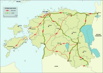 Keywords: Main roads of Estonia.svg Estonian main and E-roads created in ESRI ArcMap and Inkscape own Hannu 2009-01-26 SVG maps of Estonia E-road maps Transport maps of Estonia