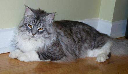 Keywords: maine coon cat feline looking cute reclining domestic curious animal pet fur long hair portrait adorable sweet head whiskers eyes ears face