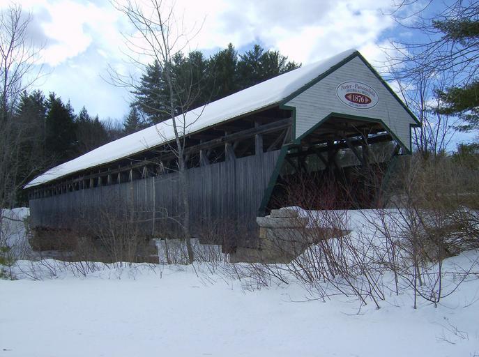 Keywords: maine covered bridge winter snow landmark historical sky clouds nature outside country countryside trees