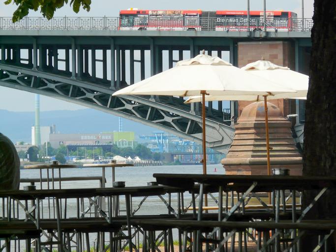Keywords: mainz-kastel beer garden out gastronomy outside catering dining tables on the river garden table parasol bridge