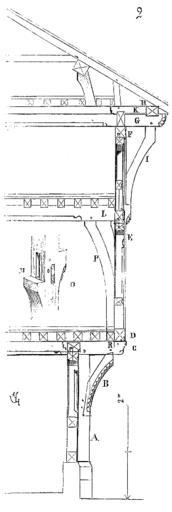 | Keywords: Maison.bois.medievale.Dreux.4.png On voyait sous les appuis des fenêtres des galetas des restes de panneaux épais également décorés par des gravures La figure 2 présente la coupe de ce pan de bois elle indique le poteau intermédiaire A renforçant la face du rez-de-chaussée et portant au moyen d'un lien B la poutre transversale C laquelle soulage d'autant la portée de la sablière basse D du pan de bois supérieur Au-dessus de ce lien B se dresse le poteau E jusque dessous la sablière haute F portant une autre poutre G transversale sous comble L'about de cette poutre est soulagé par un lien I Une semelle H reçoit l'extrémité des chevrons et les blochets K La poutre L s'assemble par un tenon dans le poteau E lequel sous cet assemblage possède un repos M voy le détail O Viollet-le-Duc House Viollet-le-Duc Carpentry Viollet-le-Duc Jetty timber framing |