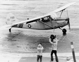 | Keywords: Major Buang taxies to a halt.jpg en A VNAF Cessna O-1E s/n SU4981 after that landing on the U S Navy aircraft carrier USS Midway CV-41 on 30 April 1975 during operation Frequent Wind the evacuation of South Vietnam The plane was piloted by South Vietnamese Air Force Major Buang and carried his wife and five children to safety Three crewmen are moving toward the plane to assist two of the deck crews are seen clapping their hands in joy The aircraft is today on display at the National Museum of Naval Aviation in Pensacola Florida USA U S Naval Aviation News July 1975 http //www history navy mil/nan/backissues/1970s/1975/jul75 pdf p 32-33; http //collections naval aviation museum/emuwebdoncoms/pages/doncoms/AdvQuery php U S Navy National Museum of Naval Aviation photo No http //collections naval aviation museum/emuwebdoncoms/pages/doncoms/Display php irn 48735 QueryPage 2Femuwebdoncoms 2Fpages 2Fdoncoms 2FAdvQuery php 2011 003 200 005 USN 1975-04-30 Operation Frequent Wind Cessna L-19 Bird Dog Aboard USS Midway CV-41 Cessna O-1 Bird Dogs during the Vietnam War Disputed The crewmen are not clapping their hands ; they are signaling the pilot instructions and directions after landing In addition the aircraft clearly does not have an arresting gear tail hook Response According to Larry Chambers Commanding Officer of the USS Midway at the time and who also was an eyewitness to the event the aircraft cleared the ramp and touched down on center line at the normal touchdown point Had he been equipped with a tailhook he could have bagged a number 3 wire He bounced once and came stop abeam of the island amid a wildly cheering arms-waving flight deck crew Of course the aircraft didn't have a tailhook as it was not designed nor intended for carrier landings PD-USGov-Military-Navy |