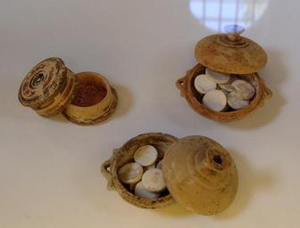 | Keywords: Make-up boxes KAM Athens 15598;15539;15537.jpg Corinthian pyxis with a red powder and two make-up pots with molded tablets of white lead all having the same diameter and weight 2 75 cm and 5 5 g Found in a tomb from the 5th c BC Pyxide corinthienne avec une poudre rougeâtre et deux pots à fard contenant des pastilles moulées de blanc de céruse de diamètre et de poids identiques 2 75 cm et 5 5 g Trouvés dans une tombe du Ve s av J -C Museum Kerameikos Archaeological Museum object history credit line accession number Inv 15598 15539 15537 User Bibi Saint-Pol own 2009-08-16 Photographie prise à l'exposition « Le Bain et le Miroir » du Musée de Cluny other versions <gallery> File KAMA Boîtes à maquillage jpg Alternative view File Make-up box KAM Athens 15539 jpg Detail File Make-up pyxis KAM Athens 15598 jpg Detail </gallery> Ancient Greek cosmetics Ancient Greek pottery pyxides Ancient Greek pottery in the Kerameikos Archaeological Museum Athens Le Bain et le Miroir exhibition 5th-century BC pottery in Athens |