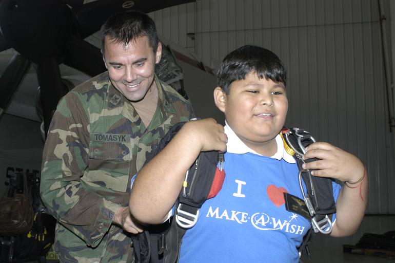 | Keywords: Make-A-Wish Kids Visit Naval Air Station North Island DVIDS348133.jpg en Petty Officer 1st Class Greg Tomasyk Special Warfare Operator SEAL assists a child with donning a parachute at the second annual Fleet Logistics Support Squadron VR 57 Holiday Party at Naval Air Station North Island VR-57 welcomed children from the San Diego-area Make-a-Wish foundation where they sat in airplane cockpits tried on uniforms and spoke with Santa Claus during their visit <br>Unit Navy Media Content Services 2010-12-04 Petty Officer 2nd Class Mark August https //www dvidshub net/image/348133/make-wish-kids-visit-naval-air-station-north-island 101204-N-+++++-098 2010-12-10 01 58 SAN DIEGO CA US PD-USGov-Military-Navy Naval Air Station North Island Images from DoD uploaded by Fæ |