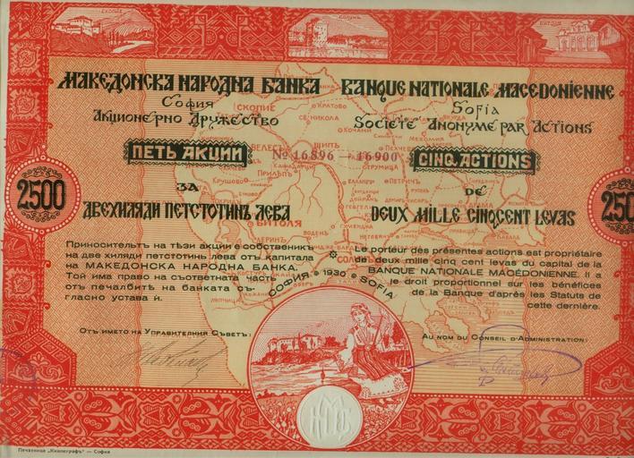 Keywords: Makedonska Narodna Banka Bond.jpg Акция на акедонската на одна банка scanned 1930 акедонска на одна банка PD-old Stock certificates of banks in Bulgaria Makedonska Narodna Banka