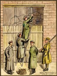 Keywords: university of victoria universityofvictoria uvic great britain. army. royal regiment of artillery greatbritainarmyroyalregimentofartillery caricatures and cartoons--20th century caricaturesandcartoons20thcentury notebooks war artists warartists world war, 1914-1918--pictorial works worldwar19141918pictorialworks world war, 1914-1918--caricatures and cartoons worldwar19141918caricaturesandcartoons drawing people vehicle bike surreal photo border Item is one of 123 pen-and-ink drawings and watercolours from two volumes titled: "Sketches of the War: France/Belgium". The sketches vary from satirical cartoons to more detailed and naturalistic renditions. They are often accompanied by an ironic title and are often signed with the artist's initials, "J.M." The artist's satirical targets include the officers and high command of both combatant sides; the disjuncture between reported and actual events, and the death of civilians as a fact of modern warfare. Item is one of 123 pen-and-ink drawings and watercolours from two volumes titled: "Sketches of the War: France/Belgium". The sketches vary from satirical cartoons to more detailed and naturalistic renditions. They are often accompanied by an ironic title and are often signed with the artist's initials, "J.M." The artist's satirical targets include the officers and high command of both combatant sides; the disjuncture between reported and actual events, and the death of civilians as a fact of modern warfare. |