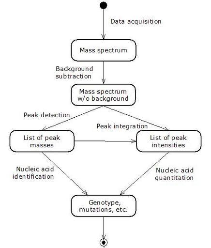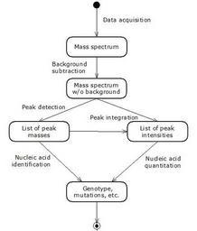 Keywords: Maldi informatics figure 6.JPG The steps in the analysis of mass spectra of nucleic acids are background subtraction peak detection and quantitation The mass and intensity of the peaks are calculated The mass is used to identify the nucleic acid from a short list of possibilities determined by the molecular biology performed during the experiment The intensity is taken as a measure of nucleic acid quantity The identity and the quantity of the nucleic acids in the sample are used to determine nucleic acid properties including genotype and mutations David Fenyo 2007-01-30 own assumed Rbeavis Check categories 2009 June 10 en wikipedia Molecular_models_of_DNA en wikipedia DNA_Dynamics 1 Databases |