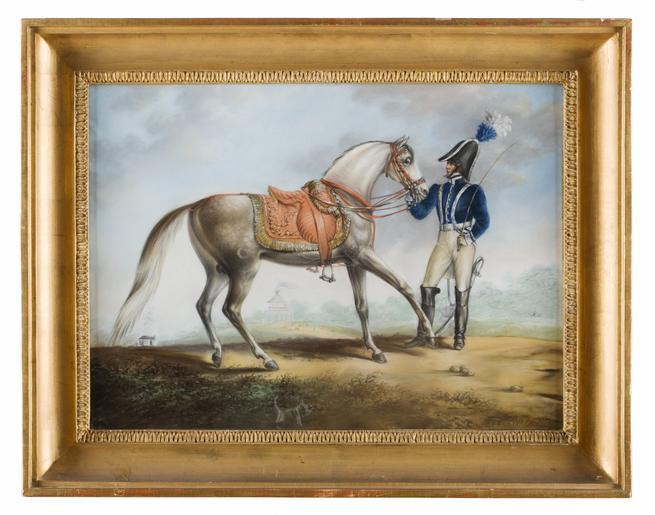 | Keywords: Måleri. Hästporträtt - Skoklosters slott - 87335.tif Apelkastad häst stående åt höger hållen av kavallerist I bakgrunden rund byggnad och trädkuliss <br/>Papp som bakre stöd klistrat med franskt tidningspapper Le Figaro från 1880-talet <br/>Förgylld profilerad ram med pastellagelist bredd 65 mm Glas <br/>Signatur C F Kiörbo del 1827 original caption Måleri Hästporträtt SKO 11565<br/> Nyckelord Kiörboe Häst Pastell Målning Kavallerist Sadel Ram Föremålsbild 1827 oil on canvas circa size mm 520 380 SKO place of origin original filename sm_dig4970_11565 32581 inventory number SKO 11565 87335 PD Jens Mohr Jens Mohr Horses in art 1827 paintings 19th-century paintings of horses Media contributed by LSH unmatched creator Media contributed by LSH unmatched keyword Media contributed by LSH 2013-10 |