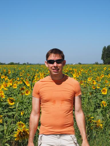 Keywords: man human person sunglasses cool casual holiday sun joy happy rays summer day idyll male sweating warm heat summer heat dazzling sunflower sunflower field mas du pont de rousty camargue france