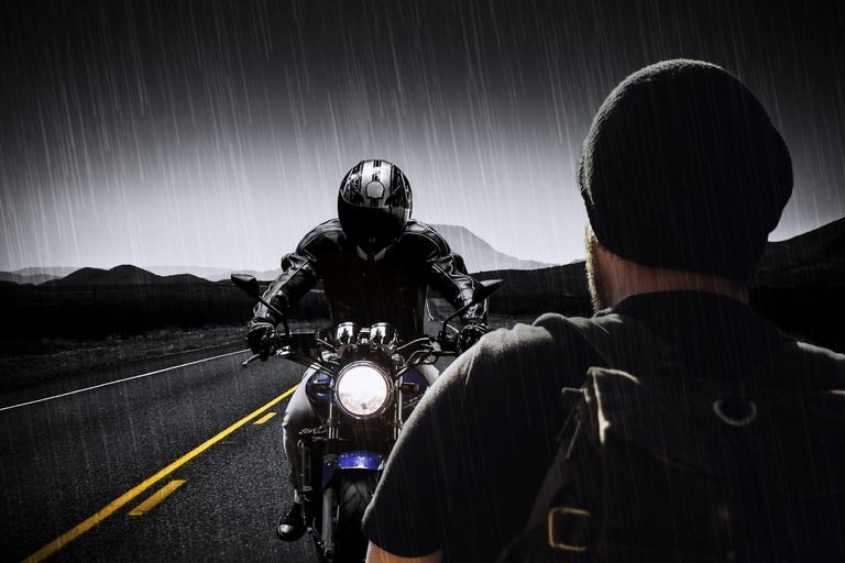 Keywords: man machine motorcycle helmet road night rain mountains landscape imagination hood rucksack wallpaper