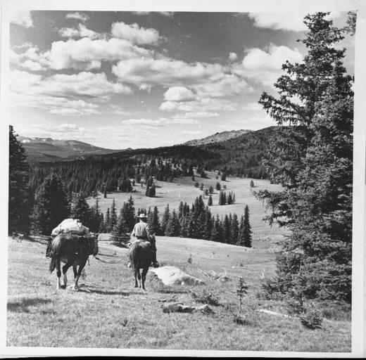 Man_on_horseback_leading_pack_animal_toward_meadows_with_mountains_in_background,_Horseshoe_Basin,_Pasayten_Wilderness.jpg (765x753)