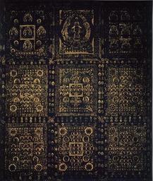 Keywords: Mandala of the Diamond Realm Kojimadera.jpg Mandala of the Two Realms 紺綾 金 泥絵両界曼荼羅図 konayajikingindeie ryōkaimandarazu at Kojimadera 子嶋寺 Takatori Nara Japan One of two hanging scrolls Gold and silver paint on dark blue silk The scrolls have been designated as National Treasure of Japan in the category paintings http //bell jp/pancho/k_diary-2/2008_11_26 htm author early 11th century PD-old-100 PD-Japan Mandala of the Two Realms Kojima-dera |
