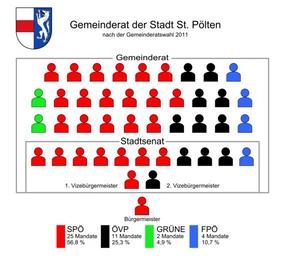 Keywords: Mandatsverteilung Gemeinderat und Stadtsenat St Poelten 2011.svg Mandatsverteilung im Gemeinderat und Stadtsenat St Pöltens nach der Gemeinderatswahl 2011 own 2012-02-25 AleXXw PD-release St Pölten