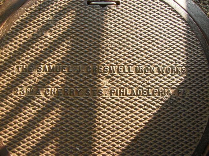 Keywords: Manhole cover with mis-spelling.jpg en Manhole cover with mis-spelling of Philadelphia Longwood Gardens 2011-05-28 18 15 41 own PookieFugglestein cc-zero Uploaded with UploadWizard Longwood Gardens Philadelphia Manhole covers