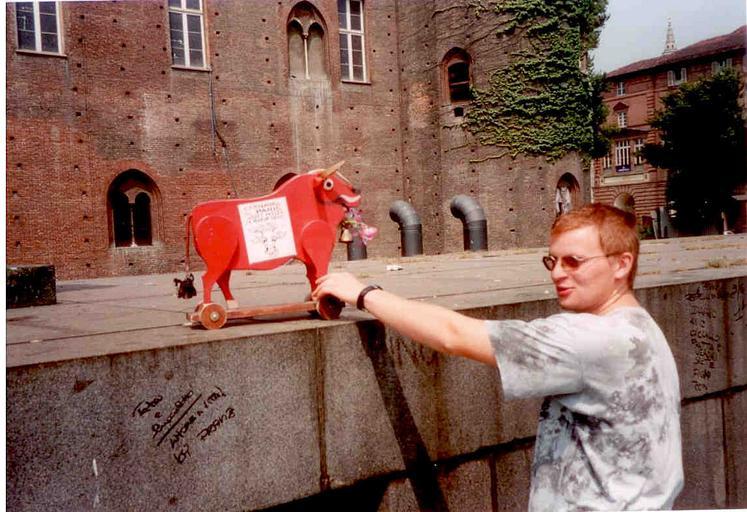 | Keywords: Manifestation des étudiants du liceo artistico et de l'Accademia Albertina di Belle Arti di Torino du 12 mai 1997 - Suite le 29 juillet 1997.jpeg fr Le mini bœuf gras monté sur roulettes a été amené sur les lieux de la manifestation du 12 mai 1997 Avec lui Paolo président du Comitato Studentesco de l'Accademia Albertina di Belle Arti di Torino organisateur de la manifestation du 12 mai own Basili 1997-05-12 Domaine public Manifestation des étudiants du Liceo artistico et de l'Accademia Albertina di Belle Arti di Torino le 12 mai 1997 à Turin Cc-zero |