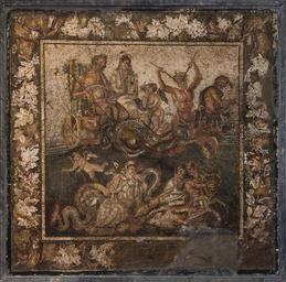 MAKE A MEME View Large Image ...Napoli 10007 Mosaic Poseidon & Amphitrite Pompeii.jpg author fr mosaïque quadrangulaire détachée du revêtement de sol encadrée de marbre Dans un cadre de feuilles sortent quatre rubans noués Neptune et Amphitrite sont dans un char ...