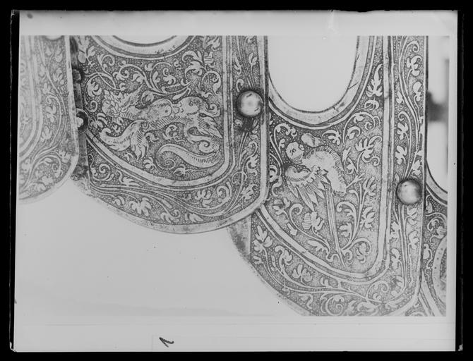 Keywords: Manpansar, möjligen tillhörigt Johan III, 1500-talets mitt - Livrustkammaren - 2413.tif LSH artwork sv Driven stålplåt med heltäckande etsad dekor Insidan svärtad med tydliga slagmärken Bestående av elva U-formiga skenor ökande i längd bakåt Skenorna lagda omlott och sammanfogade i varandra med längsgående 25 mm breda band av gulvitt sämskat skinn fästade med en nit i var skena På var sida en urtagning rektangulär med rundad nedre kant och vid sidan om denna en dekorativ nit med kullrig gulmetallhätta Kanterna nertill lätt rundade och baktill fasade Första skenan med insvängda sidor i mitten 24 mm långt spärrstift och längs yttre kanten genomgående hål i rad Sista skenans yttre kant omvikt rundsmidd och repstavsfilad bredd ca 15 mm Etsad dekor blanka figurer mot mörk bakgrund På nedre delen fabliska djur och porträtt inom ovaler omgärdat av slingrande växtrankor På övre delen olika motiv som stående lejon ställda mot varandra och mytologiska scener allt omgärdat av slingrande rankor original caption mid other date century 16 brass - leather Färg gulvit material läder - steel Färg blankt svart material stål size mm 780 330 LRK Johan III av Sverige Hästen 1991 Tre Konungar på Åbo slott 1993 Björneborg - Johans stad Satakunta Museum Björneborg/Pori 2008 Trofast - hov och tass i kunglig tjänst 2010-2011 Livrustkammaren Trogna vänner - Kungliga hästar och hundar 2011-2012 Museiverket/Finlands nationalmuseum place of origin original filename LN_E02896 59502 inventory number LRK 22860 2413 CC0 Manpansar möjligen tillhörigt Johan III 1500-talets mitt - Livrustkammaren - 2413-negative tif <gallery caption Different images of same object > File Manpansar möjligen tillhörigt Johan III 1500-talets mitt - Livrustkammaren - 19537 tif File Manpansar möjligen tillhörigt Johan III 1500-talets mitt - Livrustkammaren - 79458 tif File Manpansar möjligen tillhörigt Johan III 1500-talets mitt - Livrustkammaren - 36657 tif File Manpansar möjligen tillhörigt Johan III 1500-talets mitt - Livrustkammaren - 62337 tif File Manpansar möjligen tillhörigt Johan III 1500-talets mitt - Livrustkammaren - 70899 tif File Manpansar möjligen tillhörigt Johan III 1500-talets mitt - Livrustkammaren - 53776 tif File Manpansar möjligen tillhörigt Johan III 1500-talets mitt - Livrustkammaren - 45215 tif File Manpansar möjligen tillhörigt Johan III 1500-talets mitt - Livrustkammaren - 10973 tif File Manpansar möjligen tillhörigt Johan III 1500-talets mitt - Livrustkammaren - 35519 tif File Manpansar möjligen tillhörigt Johan III 1500-talets mitt - Livrustkammaren - 28096 tif </gallery> <gallery caption Related objects > File Ländpansar till hästrustning troligen tillhörigt Johan III 1500-tal - Livrustkammaren - 79460 tif LRK 22862 File Ländpansar till hästrustning troligen tillhörigt Johan III 1500-tal - Livrustkammaren - 36659 tif LRK 22862 File Bogpansar till hästrusning troligen tillhörigt Johan III 1500-tal - Livrustkammaren - 35526 tif LRK 22861 File Ländpansar till hästrustning troligen tillhörigt Johan III 1500-tal - Livrustkammaren - 70895 tif LRK 22862 File Bogpansar till hästrusning troligen tillhörigt Johan III 1500-tal - Livrustkammaren - 44085 tif LRK 22861 File Bogpansar till hästrusning troligen tillhörigt Johan III 1500-tal - Livrustkammaren - 79454 tif LRK 22861 File Utställningsbild sadlar hästrustningar mm - Livrustkammaren - 77173 tif LRK 22861 File Ländpansar till hästrustning har troligen tillhört Johan III 1500-tal - Livrustkammaren - 10975 tif LRK 22862 File Ländpansar till hästrustning troligen tillhörigt Johan III 1500-tal - Livrustkammaren - 2415 tif LRK 22862 </gallery> Horse armours Media contributed by LSH 2016-12 |