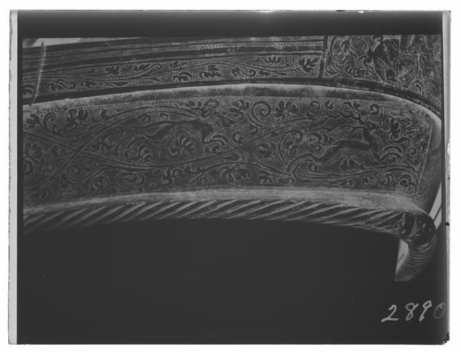 Keywords: Manpansar, möjligen tillhörigt Johan III, 1500-talets mitt - Livrustkammaren - 79458-negative.tif LSH artwork sv Driven stålplåt med heltäckande etsad dekor Insidan svärtad med tydliga slagmärken Bestående av elva U-formiga skenor ökande i längd bakåt Skenorna lagda omlott och sammanfogade i varandra med längsgående 25 mm breda band av gulvitt sämskat skinn fästade med en nit i var skena På var sida en urtagning rektangulär med rundad nedre kant och vid sidan om denna en dekorativ nit med kullrig gulmetallhätta Kanterna nertill lätt rundade och baktill fasade Första skenan med insvängda sidor i mitten 24 mm långt spärrstift och längs yttre kanten genomgående hål i rad Sista skenans yttre kant omvikt rundsmidd och repstavsfilad bredd ca 15 mm Etsad dekor blanka figurer mot mörk bakgrund På nedre delen fabliska djur och porträtt inom ovaler omgärdat av slingrande växtrankor På övre delen olika motiv som stående lejon ställda mot varandra och mytologiska scener allt omgärdat av slingrande rankor original caption mid other date century 16 brass - leather Färg gulvit material läder - steel Färg blankt svart material stål size mm 780 330 LRK Johan III av Sverige Hästen 1991 Tre Konungar på Åbo slott 1993 Björneborg - Johans stad Satakunta Museum Björneborg/Pori 2008 Trofast - hov och tass i kunglig tjänst 2010-2011 Livrustkammaren Trogna vänner - Kungliga hästar och hundar 2011-2012 Museiverket/Finlands nationalmuseum place of origin original filename LN_E02895 59502 inventory number LRK 22860 79458 CC0 Manpansar möjligen tillhörigt Johan III 1500-talets mitt - Livrustkammaren - 79458 tif <gallery caption Different images of same object > File Manpansar möjligen tillhörigt Johan III 1500-talets mitt - Livrustkammaren - 19537 tif File Manpansar möjligen tillhörigt Johan III 1500-talets mitt - Livrustkammaren - 36657 tif File Manpansar möjligen tillhörigt Johan III 1500-talets mitt - Livrustkammaren - 62337 tif File Manpansar möjligen tillhörigt Johan III 1500-talets mitt - Livrustkammaren - 70899 tif File Manpansar möjligen tillhörigt Johan III 1500-talets mitt - Livrustkammaren - 53776 tif File Manpansar möjligen tillhörigt Johan III 1500-talets mitt - Livrustkammaren - 45215 tif File Manpansar möjligen tillhörigt Johan III 1500-talets mitt - Livrustkammaren - 10973 tif File Manpansar möjligen tillhörigt Johan III 1500-talets mitt - Livrustkammaren - 35519 tif File Manpansar möjligen tillhörigt Johan III 1500-talets mitt - Livrustkammaren - 2413 tif File Manpansar möjligen tillhörigt Johan III 1500-talets mitt - Livrustkammaren - 28096 tif </gallery> <gallery caption Related objects > File Ländpansar till hästrustning troligen tillhörigt Johan III 1500-tal - Livrustkammaren - 79460 tif LRK 22862 File Ländpansar till hästrustning troligen tillhörigt Johan III 1500-tal - Livrustkammaren - 36659 tif LRK 22862 File Bogpansar till hästrusning troligen tillhörigt Johan III 1500-tal - Livrustkammaren - 35526 tif LRK 22861 File Ländpansar till hästrustning troligen tillhörigt Johan III 1500-tal - Livrustkammaren - 70895 tif LRK 22862 File Bogpansar till hästrusning troligen tillhörigt Johan III 1500-tal - Livrustkammaren - 44085 tif LRK 22861 File Bogpansar till hästrusning troligen tillhörigt Johan III 1500-tal - Livrustkammaren - 79454 tif LRK 22861 File Utställningsbild sadlar hästrustningar mm - Livrustkammaren - 77173 tif LRK 22861 File Ländpansar till hästrustning har troligen tillhört Johan III 1500-tal - Livrustkammaren - 10975 tif LRK 22862 File Ländpansar till hästrustning troligen tillhörigt Johan III 1500-tal - Livrustkammaren - 2415 tif LRK 22862 </gallery> |