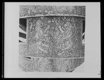 Keywords: Manpansar, möjligen tillhörigt Johan III, 1500-talets mitt - Livrustkammaren - 62337.tif LSH artwork sv Driven stålplåt med heltäckande etsad dekor Insidan svärtad med tydliga slagmärken Bestående av elva U-formiga skenor ökande i längd bakåt Skenorna lagda omlott och sammanfogade i varandra med längsgående 25 mm breda band av gulvitt sämskat skinn fästade med en nit i var skena På var sida en urtagning rektangulär med rundad nedre kant och vid sidan om denna en dekorativ nit med kullrig gulmetallhätta Kanterna nertill lätt rundade och baktill fasade Första skenan med insvängda sidor i mitten 24 mm långt spärrstift och längs yttre kanten genomgående hål i rad Sista skenans yttre kant omvikt rundsmidd och repstavsfilad bredd ca 15 mm Etsad dekor blanka figurer mot mörk bakgrund På nedre delen fabliska djur och porträtt inom ovaler omgärdat av slingrande växtrankor På övre delen olika motiv som stående lejon ställda mot varandra och mytologiska scener allt omgärdat av slingrande rankor original caption mid other date century 16 brass - leather Färg gulvit material läder - steel Färg blankt svart material stål size mm 780 330 LRK Johan III av Sverige Hästen 1991 Tre Konungar på Åbo slott 1993 Björneborg - Johans stad Satakunta Museum Björneborg/Pori 2008 Trofast - hov och tass i kunglig tjänst 2010-2011 Livrustkammaren Trogna vänner - Kungliga hästar och hundar 2011-2012 Museiverket/Finlands nationalmuseum place of origin original filename LN_E02893 59502 inventory number LRK 22860 62337 CC0 Manpansar möjligen tillhörigt Johan III 1500-talets mitt - Livrustkammaren - 62337-negative tif <gallery caption Different images of same object > File Manpansar möjligen tillhörigt Johan III 1500-talets mitt - Livrustkammaren - 19537 tif File Manpansar möjligen tillhörigt Johan III 1500-talets mitt - Livrustkammaren - 79458 tif File Manpansar möjligen tillhörigt Johan III 1500-talets mitt - Livrustkammaren - 36657 tif File Manpansar möjligen tillhörigt Johan III 1500-talets mitt - Livrustkammaren - 70899 tif File Manpansar möjligen tillhörigt Johan III 1500-talets mitt - Livrustkammaren - 53776 tif File Manpansar möjligen tillhörigt Johan III 1500-talets mitt - Livrustkammaren - 45215 tif File Manpansar möjligen tillhörigt Johan III 1500-talets mitt - Livrustkammaren - 10973 tif File Manpansar möjligen tillhörigt Johan III 1500-talets mitt - Livrustkammaren - 35519 tif File Manpansar möjligen tillhörigt Johan III 1500-talets mitt - Livrustkammaren - 2413 tif File Manpansar möjligen tillhörigt Johan III 1500-talets mitt - Livrustkammaren - 28096 tif </gallery> <gallery caption Related objects > File Ländpansar till hästrustning troligen tillhörigt Johan III 1500-tal - Livrustkammaren - 79460 tif LRK 22862 File Ländpansar till hästrustning troligen tillhörigt Johan III 1500-tal - Livrustkammaren - 36659 tif LRK 22862 File Bogpansar till hästrusning troligen tillhörigt Johan III 1500-tal - Livrustkammaren - 35526 tif LRK 22861 File Ländpansar till hästrustning troligen tillhörigt Johan III 1500-tal - Livrustkammaren - 70895 tif LRK 22862 File Bogpansar till hästrusning troligen tillhörigt Johan III 1500-tal - Livrustkammaren - 44085 tif LRK 22861 File Bogpansar till hästrusning troligen tillhörigt Johan III 1500-tal - Livrustkammaren - 79454 tif LRK 22861 File Utställningsbild sadlar hästrustningar mm - Livrustkammaren - 77173 tif LRK 22861 File Ländpansar till hästrustning har troligen tillhört Johan III 1500-tal - Livrustkammaren - 10975 tif LRK 22862 File Ländpansar till hästrustning troligen tillhörigt Johan III 1500-tal - Livrustkammaren - 2415 tif LRK 22862 </gallery> Horse armours Media contributed by LSH 2016-12 |