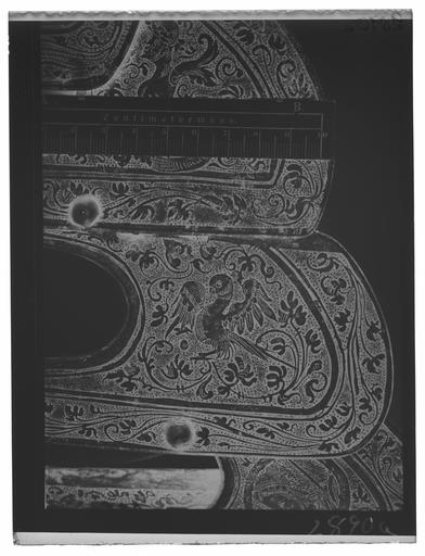 Keywords: Manpansar, möjligen tillhörigt Johan III, 1500-talets mitt - Livrustkammaren - 10973-negative.tif LSH artwork sv Driven stålplåt med heltäckande etsad dekor Insidan svärtad med tydliga slagmärken Bestående av elva U-formiga skenor ökande i längd bakåt Skenorna lagda omlott och sammanfogade i varandra med längsgående 25 mm breda band av gulvitt sämskat skinn fästade med en nit i var skena På var sida en urtagning rektangulär med rundad nedre kant och vid sidan om denna en dekorativ nit med kullrig gulmetallhätta Kanterna nertill lätt rundade och baktill fasade Första skenan med insvängda sidor i mitten 24 mm långt spärrstift och längs yttre kanten genomgående hål i rad Sista skenans yttre kant omvikt rundsmidd och repstavsfilad bredd ca 15 mm Etsad dekor blanka figurer mot mörk bakgrund På nedre delen fabliska djur och porträtt inom ovaler omgärdat av slingrande växtrankor På övre delen olika motiv som stående lejon ställda mot varandra och mytologiska scener allt omgärdat av slingrande rankor original caption mid other date century 16 brass - leather Färg gulvit material läder - steel Färg blankt svart material stål size mm 780 330 LRK Johan III av Sverige Hästen 1991 Tre Konungar på Åbo slott 1993 Björneborg - Johans stad Satakunta Museum Björneborg/Pori 2008 Trofast - hov och tass i kunglig tjänst 2010-2011 Livrustkammaren Trogna vänner - Kungliga hästar och hundar 2011-2012 Museiverket/Finlands nationalmuseum place of origin original filename LN_E02897 59502 inventory number LRK 22860 10973 CC0 Manpansar möjligen tillhörigt Johan III 1500-talets mitt - Livrustkammaren - 10973 tif <gallery caption Different images of same object > File Manpansar möjligen tillhörigt Johan III 1500-talets mitt - Livrustkammaren - 19537 tif File Manpansar möjligen tillhörigt Johan III 1500-talets mitt - Livrustkammaren - 79458 tif File Manpansar möjligen tillhörigt Johan III 1500-talets mitt - Livrustkammaren - 36657 tif File Manpansar möjligen tillhörigt Johan III 1500-talets mitt - Livrustkammaren - 62337 tif File Manpansar möjligen tillhörigt Johan III 1500-talets mitt - Livrustkammaren - 70899 tif File Manpansar möjligen tillhörigt Johan III 1500-talets mitt - Livrustkammaren - 53776 tif File Manpansar möjligen tillhörigt Johan III 1500-talets mitt - Livrustkammaren - 45215 tif File Manpansar möjligen tillhörigt Johan III 1500-talets mitt - Livrustkammaren - 35519 tif File Manpansar möjligen tillhörigt Johan III 1500-talets mitt - Livrustkammaren - 2413 tif File Manpansar möjligen tillhörigt Johan III 1500-talets mitt - Livrustkammaren - 28096 tif </gallery> <gallery caption Related objects > File Ländpansar till hästrustning troligen tillhörigt Johan III 1500-tal - Livrustkammaren - 79460 tif LRK 22862 File Ländpansar till hästrustning troligen tillhörigt Johan III 1500-tal - Livrustkammaren - 36659 tif LRK 22862 File Bogpansar till hästrusning troligen tillhörigt Johan III 1500-tal - Livrustkammaren - 35526 tif LRK 22861 File Ländpansar till hästrustning troligen tillhörigt Johan III 1500-tal - Livrustkammaren - 70895 tif LRK 22862 File Bogpansar till hästrusning troligen tillhörigt Johan III 1500-tal - Livrustkammaren - 44085 tif LRK 22861 File Bogpansar till hästrusning troligen tillhörigt Johan III 1500-tal - Livrustkammaren - 79454 tif LRK 22861 File Utställningsbild sadlar hästrustningar mm - Livrustkammaren - 77173 tif LRK 22861 File Ländpansar till hästrustning har troligen tillhört Johan III 1500-tal - Livrustkammaren - 10975 tif LRK 22862 File Ländpansar till hästrustning troligen tillhörigt Johan III 1500-tal - Livrustkammaren - 2415 tif LRK 22862 </gallery> |