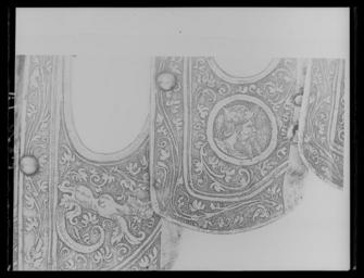 Keywords: Manpansar, möjligen tillhörigt Johan III, 1500-talets mitt - Livrustkammaren - 36657.tif LSH artwork sv Driven stålplåt med heltäckande etsad dekor Insidan svärtad med tydliga slagmärken Bestående av elva U-formiga skenor ökande i längd bakåt Skenorna lagda omlott och sammanfogade i varandra med längsgående 25 mm breda band av gulvitt sämskat skinn fästade med en nit i var skena På var sida en urtagning rektangulär med rundad nedre kant och vid sidan om denna en dekorativ nit med kullrig gulmetallhätta Kanterna nertill lätt rundade och baktill fasade Första skenan med insvängda sidor i mitten 24 mm långt spärrstift och längs yttre kanten genomgående hål i rad Sista skenans yttre kant omvikt rundsmidd och repstavsfilad bredd ca 15 mm Etsad dekor blanka figurer mot mörk bakgrund På nedre delen fabliska djur och porträtt inom ovaler omgärdat av slingrande växtrankor På övre delen olika motiv som stående lejon ställda mot varandra och mytologiska scener allt omgärdat av slingrande rankor original caption mid other date century 16 brass - leather Färg gulvit material läder - steel Färg blankt svart material stål size mm 780 330 LRK Johan III av Sverige Hästen 1991 Tre Konungar på Åbo slott 1993 Björneborg - Johans stad Satakunta Museum Björneborg/Pori 2008 Trofast - hov och tass i kunglig tjänst 2010-2011 Livrustkammaren Trogna vänner - Kungliga hästar och hundar 2011-2012 Museiverket/Finlands nationalmuseum place of origin original filename LN_E02890 59502 inventory number LRK 22860 36657 CC0 Manpansar möjligen tillhörigt Johan III 1500-talets mitt - Livrustkammaren - 36657-negative tif <gallery caption Different images of same object > File Manpansar möjligen tillhörigt Johan III 1500-talets mitt - Livrustkammaren - 19537 tif File Manpansar möjligen tillhörigt Johan III 1500-talets mitt - Livrustkammaren - 79458 tif File Manpansar möjligen tillhörigt Johan III 1500-talets mitt - Livrustkammaren - 62337 tif File Manpansar möjligen tillhörigt Johan III 1500-talets mitt - Livrustkammaren - 70899 tif File Manpansar möjligen tillhörigt Johan III 1500-talets mitt - Livrustkammaren - 53776 tif File Manpansar möjligen tillhörigt Johan III 1500-talets mitt - Livrustkammaren - 45215 tif File Manpansar möjligen tillhörigt Johan III 1500-talets mitt - Livrustkammaren - 10973 tif File Manpansar möjligen tillhörigt Johan III 1500-talets mitt - Livrustkammaren - 35519 tif File Manpansar möjligen tillhörigt Johan III 1500-talets mitt - Livrustkammaren - 2413 tif File Manpansar möjligen tillhörigt Johan III 1500-talets mitt - Livrustkammaren - 28096 tif </gallery> <gallery caption Related objects > File Ländpansar till hästrustning troligen tillhörigt Johan III 1500-tal - Livrustkammaren - 79460 tif LRK 22862 File Ländpansar till hästrustning troligen tillhörigt Johan III 1500-tal - Livrustkammaren - 36659 tif LRK 22862 File Bogpansar till hästrusning troligen tillhörigt Johan III 1500-tal - Livrustkammaren - 35526 tif LRK 22861 File Ländpansar till hästrustning troligen tillhörigt Johan III 1500-tal - Livrustkammaren - 70895 tif LRK 22862 File Bogpansar till hästrusning troligen tillhörigt Johan III 1500-tal - Livrustkammaren - 44085 tif LRK 22861 File Bogpansar till hästrusning troligen tillhörigt Johan III 1500-tal - Livrustkammaren - 79454 tif LRK 22861 File Utställningsbild sadlar hästrustningar mm - Livrustkammaren - 77173 tif LRK 22861 File Ländpansar till hästrustning har troligen tillhört Johan III 1500-tal - Livrustkammaren - 10975 tif LRK 22862 File Ländpansar till hästrustning troligen tillhörigt Johan III 1500-tal - Livrustkammaren - 2415 tif LRK 22862 </gallery> Horse armours Media contributed by LSH 2016-12 |