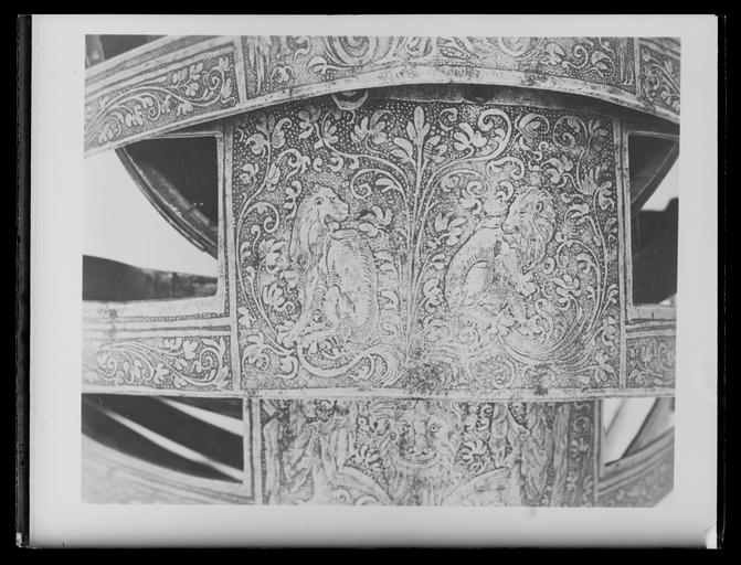 Keywords: Manpansar, möjligen tillhörigt Johan III, 1500-talets mitt - Livrustkammaren - 45215.tif LSH artwork sv Driven stålplåt med heltäckande etsad dekor Insidan svärtad med tydliga slagmärken Bestående av elva U-formiga skenor ökande i längd bakåt Skenorna lagda omlott och sammanfogade i varandra med längsgående 25 mm breda band av gulvitt sämskat skinn fästade med en nit i var skena På var sida en urtagning rektangulär med rundad nedre kant och vid sidan om denna en dekorativ nit med kullrig gulmetallhätta Kanterna nertill lätt rundade och baktill fasade Första skenan med insvängda sidor i mitten 24 mm långt spärrstift och längs yttre kanten genomgående hål i rad Sista skenans yttre kant omvikt rundsmidd och repstavsfilad bredd ca 15 mm Etsad dekor blanka figurer mot mörk bakgrund På nedre delen fabliska djur och porträtt inom ovaler omgärdat av slingrande växtrankor På övre delen olika motiv som stående lejon ställda mot varandra och mytologiska scener allt omgärdat av slingrande rankor original caption mid other date century 16 brass - leather Färg gulvit material läder - steel Färg blankt svart material stål size mm 780 330 LRK Johan III av Sverige Hästen 1991 Tre Konungar på Åbo slott 1993 Björneborg - Johans stad Satakunta Museum Björneborg/Pori 2008 Trofast - hov och tass i kunglig tjänst 2010-2011 Livrustkammaren Trogna vänner - Kungliga hästar och hundar 2011-2012 Museiverket/Finlands nationalmuseum place of origin original filename LN_E02891 59502 inventory number LRK 22860 45215 CC0 Manpansar möjligen tillhörigt Johan III 1500-talets mitt - Livrustkammaren - 45215-negative tif <gallery caption Different images of same object > File Manpansar möjligen tillhörigt Johan III 1500-talets mitt - Livrustkammaren - 19537 tif File Manpansar möjligen tillhörigt Johan III 1500-talets mitt - Livrustkammaren - 79458 tif File Manpansar möjligen tillhörigt Johan III 1500-talets mitt - Livrustkammaren - 36657 tif File Manpansar möjligen tillhörigt Johan III 1500-talets mitt - Livrustkammaren - 62337 tif File Manpansar möjligen tillhörigt Johan III 1500-talets mitt - Livrustkammaren - 70899 tif File Manpansar möjligen tillhörigt Johan III 1500-talets mitt - Livrustkammaren - 53776 tif File Manpansar möjligen tillhörigt Johan III 1500-talets mitt - Livrustkammaren - 10973 tif File Manpansar möjligen tillhörigt Johan III 1500-talets mitt - Livrustkammaren - 35519 tif File Manpansar möjligen tillhörigt Johan III 1500-talets mitt - Livrustkammaren - 2413 tif File Manpansar möjligen tillhörigt Johan III 1500-talets mitt - Livrustkammaren - 28096 tif </gallery> <gallery caption Related objects > File Ländpansar till hästrustning troligen tillhörigt Johan III 1500-tal - Livrustkammaren - 79460 tif LRK 22862 File Ländpansar till hästrustning troligen tillhörigt Johan III 1500-tal - Livrustkammaren - 36659 tif LRK 22862 File Bogpansar till hästrusning troligen tillhörigt Johan III 1500-tal - Livrustkammaren - 35526 tif LRK 22861 File Ländpansar till hästrustning troligen tillhörigt Johan III 1500-tal - Livrustkammaren - 70895 tif LRK 22862 File Bogpansar till hästrusning troligen tillhörigt Johan III 1500-tal - Livrustkammaren - 44085 tif LRK 22861 File Bogpansar till hästrusning troligen tillhörigt Johan III 1500-tal - Livrustkammaren - 79454 tif LRK 22861 File Utställningsbild sadlar hästrustningar mm - Livrustkammaren - 77173 tif LRK 22861 File Ländpansar till hästrustning har troligen tillhört Johan III 1500-tal - Livrustkammaren - 10975 tif LRK 22862 File Ländpansar till hästrustning troligen tillhörigt Johan III 1500-tal - Livrustkammaren - 2415 tif LRK 22862 </gallery> Horse armours Media contributed by LSH 2016-12 |
