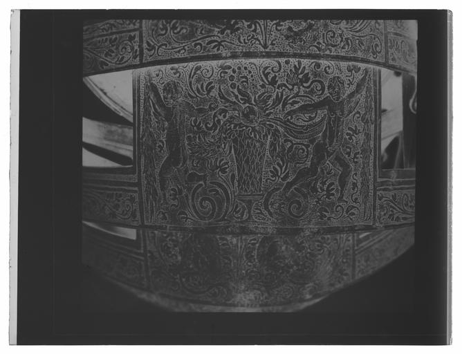 Keywords: Manpansar, möjligen tillhörigt Johan III, 1500-talets mitt - Livrustkammaren - 53776-negative.tif LSH artwork sv Driven stålplåt med heltäckande etsad dekor Insidan svärtad med tydliga slagmärken Bestående av elva U-formiga skenor ökande i längd bakåt Skenorna lagda omlott och sammanfogade i varandra med längsgående 25 mm breda band av gulvitt sämskat skinn fästade med en nit i var skena På var sida en urtagning rektangulär med rundad nedre kant och vid sidan om denna en dekorativ nit med kullrig gulmetallhätta Kanterna nertill lätt rundade och baktill fasade Första skenan med insvängda sidor i mitten 24 mm långt spärrstift och längs yttre kanten genomgående hål i rad Sista skenans yttre kant omvikt rundsmidd och repstavsfilad bredd ca 15 mm Etsad dekor blanka figurer mot mörk bakgrund På nedre delen fabliska djur och porträtt inom ovaler omgärdat av slingrande växtrankor På övre delen olika motiv som stående lejon ställda mot varandra och mytologiska scener allt omgärdat av slingrande rankor original caption mid other date century 16 brass - leather Färg gulvit material läder - steel Färg blankt svart material stål size mm 780 330 LRK Johan III av Sverige Hästen 1991 Tre Konungar på Åbo slott 1993 Björneborg - Johans stad Satakunta Museum Björneborg/Pori 2008 Trofast - hov och tass i kunglig tjänst 2010-2011 Livrustkammaren Trogna vänner - Kungliga hästar och hundar 2011-2012 Museiverket/Finlands nationalmuseum place of origin original filename LN_E02892 59502 inventory number LRK 22860 53776 CC0 Manpansar möjligen tillhörigt Johan III 1500-talets mitt - Livrustkammaren - 53776 tif <gallery caption Different images of same object > File Manpansar möjligen tillhörigt Johan III 1500-talets mitt - Livrustkammaren - 19537 tif File Manpansar möjligen tillhörigt Johan III 1500-talets mitt - Livrustkammaren - 36657 tif File Manpansar möjligen tillhörigt Johan III 1500-talets mitt - Livrustkammaren - 62337 tif File Manpansar möjligen tillhörigt Johan III 1500-talets mitt - Livrustkammaren - 70899 tif File Manpansar möjligen tillhörigt Johan III 1500-talets mitt - Livrustkammaren - 79458 tif File Manpansar möjligen tillhörigt Johan III 1500-talets mitt - Livrustkammaren - 45215 tif File Manpansar möjligen tillhörigt Johan III 1500-talets mitt - Livrustkammaren - 10973 tif File Manpansar möjligen tillhörigt Johan III 1500-talets mitt - Livrustkammaren - 35519 tif File Manpansar möjligen tillhörigt Johan III 1500-talets mitt - Livrustkammaren - 2413 tif File Manpansar möjligen tillhörigt Johan III 1500-talets mitt - Livrustkammaren - 28096 tif </gallery> <gallery caption Related objects > File Ländpansar till hästrustning troligen tillhörigt Johan III 1500-tal - Livrustkammaren - 79460 tif LRK 22862 File Ländpansar till hästrustning troligen tillhörigt Johan III 1500-tal - Livrustkammaren - 36659 tif LRK 22862 File Bogpansar till hästrusning troligen tillhörigt Johan III 1500-tal - Livrustkammaren - 35526 tif LRK 22861 File Ländpansar till hästrustning troligen tillhörigt Johan III 1500-tal - Livrustkammaren - 70895 tif LRK 22862 File Bogpansar till hästrusning troligen tillhörigt Johan III 1500-tal - Livrustkammaren - 44085 tif LRK 22861 File Bogpansar till hästrusning troligen tillhörigt Johan III 1500-tal - Livrustkammaren - 79454 tif LRK 22861 File Utställningsbild sadlar hästrustningar mm - Livrustkammaren - 77173 tif LRK 22861 File Ländpansar till hästrustning har troligen tillhört Johan III 1500-tal - Livrustkammaren - 10975 tif LRK 22862 File Ländpansar till hästrustning troligen tillhörigt Johan III 1500-tal - Livrustkammaren - 2415 tif LRK 22862 </gallery> |