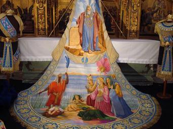 | Keywords: Manto Moisés en el Nilo Paso Azul.JPG  Manto que representa a Moisés con las Tablas de la Ley y a Moisés siendo rescatado de las aguas del Nilo Manto bordado a mano por bordadoras lorquinas Semana Santa Lorca Own 2008-03-20 Awuachumele Holy Week in Lorca |