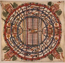 | Keywords: Manusyaloka, Map of the Human World WDL3191.png Artwork ru анушьялока ка та ми а людей fr Manuṣyaloka Carte du monde humain en Manusyaloka Map of the Human World zh 人界,人类世界 图 pt Manusyaloka Mapa do Mundo Humano ar مانيوسيالوكا، خريطة العالم الإنساني ru Джайнизм является одной из елигий Индии основателем кото ой в 6-ом веке до н э был Ва дхамана ахави а духовный лиде называемый Джина победитель Джайнизм п оповедует ненанесение в еда любым живым существам Основой философии и духовной п актики джайнизма является главным об азом ст емление к восхождению души по ступеням духовной лестницы к божественному сознанию во вселенной не имеющей начала и конца Джайнизм асполагает собственной геог афической и космологической моделью в кото ой вселенная азделяется на т и ца ства ве хнее ца ство - небесная обитель населенная небожителями; с еднее ца ство - ми людей животных и астений; нижнее ца ство - обиталище п оклятых существ ца ство хаоса Эта космологическая схема <em>манушьялоки</em> ми а людей была создана в 19-ом веке в штате Раджастан на западе Индии где п оживает наибольшее число последователей джайнизма а схеме изоб ажена область <em>Адхаи-двипа</em> или два с половиной континента населенные сме тными существами Континенты изоб ажены в виде концент ических к угов ок уженных кольцеоб азными океанами в кото ых плавают ыбы и д угие существа К оме того на схему нанесена сложная сеть ек и озе и го ные цепи В цент е схемы асполагается континент Джамбудвипа ост ов де ева с озовыми яблоками ок уженный синим кольцом п едставляющим Лавану Самуд у Соленый океан Следующее кольцо соответствует континенту Дхатакикханда ок уженному океаном Калодадхи Океан че ных вод К айняя полоса п едставляет половину т етьего континента Пушка адвипы ост ов лотоса К айнюю полосу ок ужают азноцветные ве шины го ного х ебта отмечающего г аницу ми а сме тных существ а асположенные по углам схемы шат ы п инадлежат небесным ст ажам ми а людей <br>Космология джайнизма; Ка ты ми а fr Le jaïnisme est une religion indienne fondée par Vardhamana Mahavira un chef spirituel appelé le Jina le conquérant au sixième siècle av J -C Le jaïnisme prêche la non violence envers tous les êtres vivants Sa philosophie et sa pratique reposent principalement sur l'effort visant à faire progresser l'âme sur l'échelle spirituelle vers la conscience divine dans un univers qui ne possède ni fin ni commencement Le jaïnisme possède sa propre version de la géographie et de la cosmologie dans laquelle l'univers est divisé en trois royaumes en haut se trouve le royaume des cieux et du divin celui du milieu est le domaine des humains des animaux et des plantes et celui d'en bas appartient aux damnés et au désordre Cette représentation cosmologique du <em>manuṣyaloka</em> le monde humain du XIX<sup>e</sup> siècle provient du Rajasthan occidental un état indien possédant l'une des populations jaïne les plus importantes La carte montre le <em>Adhai-dvipa</em> c'est-à-dire les deux continents et demi habités par les mortels Les continents sont représentés par des cercles concentriques entourés d'océans en forme d'anneau remplis de nageurs et de poissons où apparaissent un réseau complexe de rivières et de lacs ainsi que des chaînes de montagnes Le continent Jambudvipa l'île du pommier-rose figure au milieu de la carte entouré par un anneau bleu qui représente le Lavana Samudra Océan salé L'anneau suivant correspond au continent Dhatakikanda délimité par le Kalodadhi Océan aux eaux-noires La bande la plus à l'extérieur représente la moitié de Pushkaradvipa l'île du lotus le troisième continent Cette bande finale est entourée par les sommets multicolores des chaînes de montagnes délimitant le domaine des mortels tandis que les pavillons aux coins de la carte représentent les gardiens célestes du monde humain <br>Cosmologie jaïniste; Cartes du monde en Jainism is an Indian religion which was founded by Vardhamana Mahavira a spiritual leader called the Jina conqueror in the sixth century B C Jainism teaches nonviolence towards all living beings Its philosophy and practice rely mainly on the effort of advancing the soul on the spiritual ladder to divine consciousness in a universe that has no beginning or end Jainism has its own version of geography and cosmology in which the universe is divided into three kingdoms the upper is the realm of the heavens and the celestials; the middle is the domain of humans animals and plants; and the lower which belongs to the