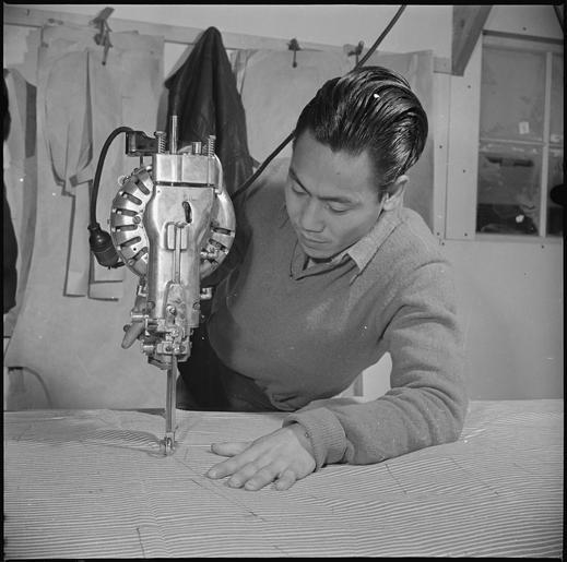 | Keywords: Manzanar Relocation Center, Manzanar, California. Bert Miura, former garment factory worker from Lo . . . - NARA - 536932.tif Scope and content The full caption for this photograph reads Manzanar Relocation Center Manzanar California Bert Miura former garment factory worker from Los Angeles California is now working in the cutting department in the garment factory He is shown cutting material for mattress tacking All work in this garment factory which produces work clothing for evacuee workers is done by Japanese American residents General notes 536932 Local identifier 210-G-B197 Department of the Interior War Relocation Authority 02/16/1944 - 06/30/1946 NARA-Author Stewart Francis War Relocation Authority photographer Photographer 8464475 <br /> Still Picture Records Section Special Media Archives Services Division NWCS-S National Archives at College Park 8601 Adelphi Road College Park MD 20740-6001 1943-02-13 Record group Record Group 210 Records of the War Relocation Authority 1941 - 1989 Record group ARC 537 Central Photographic File of the War Relocation Authority compiled 1942 - 1945 Series ARC 536000 File unit File unit ARC Variant control numbers NAIL Control Number NWDNS-210-G-B197 yes Other versions <gallery> File Manzanar_Relocation_Center _Manzanar _California _Bert_Miura _former_garment_factory_worker_from_Lo_ _ _ _-_NARA_-_536932 tif tif File Manzanar_Relocation_Center _Manzanar _California _Bert_Miura _former_garment_factory_worker_from_Lo_ _ _ _-_NARA_-_536932 jpg jpg </gallery> NARA-cooperation PD-USGov Manzanar War Relocation Center NARA TIF images with categorized JPGs Garment workers |