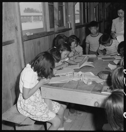 Keywords: Manzanar Relocation Center, Manzanar, California. These young evacuees are attending the first elem . . . - NARA - 537956.jpg Scope and content The full caption for this photograph reads Manzanar Relocation Center Manzanar California These young evacuees are attending the first elementary school at this War Relocation Authority center There are six grades with volunteer teachers and voluntary attendance General notes 537956 Local identifier 210-G-C658 Department of the Interior War Relocation Authority 02/16/1944 - 06/30/1946 NARA-Author Lange Dorothea 1895-1965 Photographer 1372774 <br /> Still Picture Records Section Special Media Archives Services Division NWCS-S National Archives at College Park 8601 Adelphi Road College Park MD 20740-6001 1942-07-01 Record group Record Group 210 Records of the War Relocation Authority 1941 - 1989 Record group ARC 537 Central Photographic File of the War Relocation Authority compiled 1942 - 1945 Series ARC 536000 File unit File unit ARC Variant control numbers NAIL Control Number NWDNS-210-G-C658 Other versions <gallery> File Manzanar_Relocation_Center _Manzanar _California _These_young_evacuees_are_attending_the_first_elem_ _ _ _-_NARA_-_537956 tif tif File Manzanar_Relocation_Center _Manzanar _California _These_young_evacuees_are_attending_the_first_elem_ _ _ _-_NARA_-_537956 jpg jpg </gallery> NARA-cooperation PD-USGov Photographs by Dorothea Lange of Manzanar War Relocation Center |