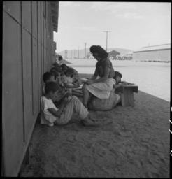 | Keywords: Manzanar Relocation Center, Manzanar, California. An elementary school with voluntary evacuee atten . . . - NARA - 537966.jpg  Scope and content The full caption for this photograph reads Manzanar Relocation Center Manzanar California An elementary school with voluntary evacuee attendance has been established with volunteer evacuee teachers most of whom are college graduates No school equipment is as yet obtainable and available tables and benches are used However classes are often held in the shade of the barrack building at this War Relocation Authority center General notes 537966 Local identifier 210-G-C669 Department of the Interior War Relocation Authority 02/16/1944 - 06/30/1946 NARA-Author Lange Dorothea 1895-1965 Photographer 1372774 <br /> Still Picture Records Section Special Media Archives Services Division NWCS-S National Archives at College Park 8601 Adelphi Road College Park MD 20740-6001 1942-07-01 Record group Record Group 210 Records of the War Relocation Authority 1941 - 1989 Record group ARC 537 Central Photographic File of the War Relocation Authority compiled 1942 - 1945 Series ARC 536000 File unit File unit ARC Variant control numbers NAIL Control Number NWDNS-210-G-C669 Other versions <gallery> File Manzanar_Relocation_Center _Manzanar _California _An_elementary_school_with_voluntary_evacuee_atten_ _ _ _-_NARA_-_537966 tif tif File Manzanar_Relocation_Center _Manzanar _California _An_elementary_school_with_voluntary_evacuee_atten_ _ _ _-_NARA_-_537966 jpg jpg </gallery> NARA-cooperation PD-USGov Photographs by Dorothea Lange of Manzanar War Relocation Center Children of the United States Manzanar People of California Manzanar Schools in California Manzanar Classrooms in the United States Manzanar NARA images of Inyo County California Black and white photographs of children Manzanar Black and white photographs of classrooms Manzanar Black and white photographs of California |