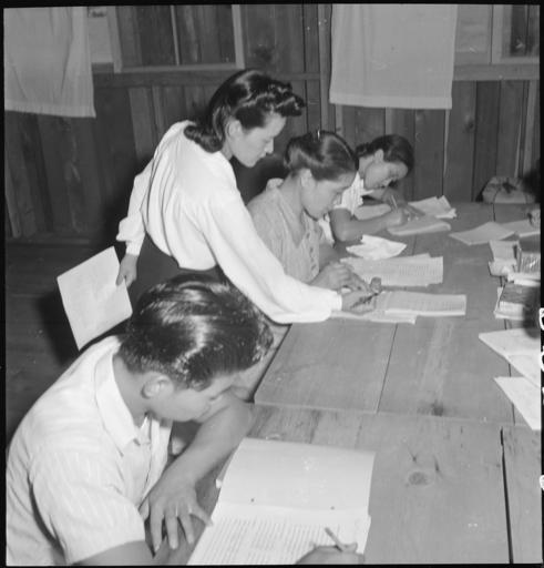 | Keywords: Manzanar Relocation Center, Manzanar, California. Part of a class under the Adult Education Program . . . - NARA - 538091.jpg Scope and content The full caption for this photograph reads Manzanar Relocation Center Manzanar California Part of a class under the Adult Education Program at this War Relocation Authority center It is composed of Issei and Kibei evacuees who are studying the Ideals of American Citizenship and the English language with which they are unfamiliar There are 18 such classes with an average of 20 volunteer members and each conducted by a volunteer instructor General notes 538091 Local identifier 210-G-C798 Department of the Interior War Relocation Authority 02/16/1944 - 06/30/1946 NARA-Author Lange Dorothea 1895-1965 Photographer 1372774 <br /> Still Picture Records Section Special Media Archives Services Division NWCS-S National Archives at College Park 8601 Adelphi Road College Park MD 20740-6001 1942-07-03 Record group Record Group 210 Records of the War Relocation Authority 1941 - 1989 Record group ARC 537 Central Photographic File of the War Relocation Authority compiled 1942 - 1945 Series ARC 536000 File unit File unit ARC Variant control numbers NAIL Control Number NWDNS-210-G-C798 Other versions <gallery> File Manzanar_Relocation_Center _Manzanar _California _Part_of_a_class_under_the_Adult_Education_Program_ _ _ _-_NARA_-_538091 tif tif File Manzanar_Relocation_Center _Manzanar _California _Part_of_a_class_under_the_Adult_Education_Program_ _ _ _-_NARA_-_538091 jpg jpg </gallery> NARA-cooperation PD-USGov Photographs by Dorothea Lange of Manzanar War Relocation Center |