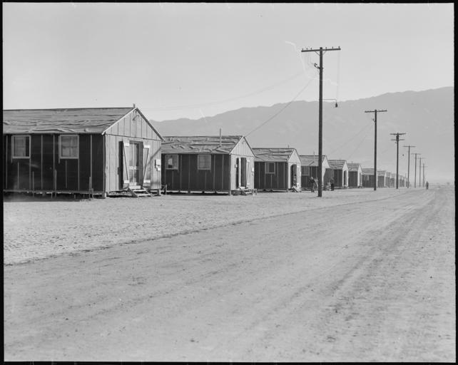 | Keywords: Manzanar Relocation Center, Manzanar, California. Street scene of barrack homes at this War Relocat . . . - NARA - 538126.jpg Scope and content The full caption for this photograph reads Manzanar Relocation Center Manzanar California Street scene of barrack homes at this War Relocation Authority center for evacuees of Japanese ancestry General notes 538126 Local identifier 210-G-C835 Department of the Interior War Relocation Authority 02/16/1944 - 06/30/1946 NARA-Author Lange Dorothea 1895-1965 Photographer 1372774 <br /> Still Picture Records Section Special Media Archives Services Division NWCS-S National Archives at College Park 8601 Adelphi Road College Park MD 20740-6001 1942-06-29 Record group Record Group 210 Records of the War Relocation Authority 1941 - 1989 Record group ARC 537 Central Photographic File of the War Relocation Authority compiled 1942 - 1945 Series ARC 536000 File unit File unit ARC Variant control numbers NAIL Control Number NWDNS-210-G-C835 Other versions <gallery> File Manzanar_Relocation_Center _Manzanar _California _Street_scene_of_barrack_homes_at_this_War_Relocat_ _ _ _-_NARA_-_538126 tif tif File Manzanar_Relocation_Center _Manzanar _California _Street_scene_of_barrack_homes_at_this_War_Relocat_ _ _ _-_NARA_-_538126 jpg jpg </gallery> NARA-cooperation PD-USGov Photographs by Dorothea Lange of Manzanar War Relocation Center |