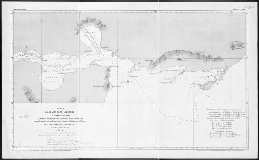 | Keywords: Map of the Anadyr Estuary in the Bering Sea- From a Map by the American Engineer Bulkley in 1815, and Corrected According to the Observations of the Clipper "Gaidamak" in 1875 WDL121.png Artwork ru Гид ог афический отдел инисте ства по мо ским делам и ыболовству fr Département Hydrographique du Ministère de la Marine en Hydrographic Department of the Ministry of Marine zh 海洋部水文部门 pt Departamento Hidrográfico do Ministério da Marinha ar القسم الهيدروغرافي في وزارة الشئون البحرية es Departamento Hidrográfico del Ministerio de Marina ru Ка та устья еки Анады ь впадающей в Бе ингово мо е а основе ка ты аме иканского инжене а Балкли 1815 г исп авлено с учетом наблюдений сделанных с клипе а Гайдамак в 1875 году fr Carte de l'estuaire d'Anadyr dans la mer de Béring Carte de l'Ingénieur américain Bulkley datant de 1815 ; corrigée d'après les observations du Clipper Gaidamak en 1875 en Map of the Anadyr Estuary in the Bering Sea From a Map by the American Engineer Bulkley in 1815 and Corrected According to the Observations of the Clipper Gaidamak in 1875 zh 白令海阿纳德尔河口 图 根据美国工程师布克利于1815年绘制的 图改编,根据1875年 骑手 号快 帆船观测结 校正 pt Mapa do Estuário Anadyr no Mar de Bering De um mapa elaborado pelo engenheiro americano Bulkley em 1815 e corriigido conforme observações do Clipper Gaidamak em 1875 ar خريطة لمصب الأنادير في بحر بيرنغ من خريطة للمهندس الأمريكي بلكلي في 1815، ومصححة طبقا لملاحظات السفينة الشراعية غيدامارك في 1875 ru Эта ка та п едназначалась для мо еплавателей П иведенная сп ава таблица соде жит под обные навигационные сведения в том числе список истинных ку сов из точки А и магнитные склонения в точках А B и С Также указаны летние кочевнические лаге я чукчей отмели и бе еговые скалы В августе 1889 года спустя почти т инадцать лет после составления этой ка ты оссийская экспедиция основала в этом месте поселение ово- а иинск В 1923 году ово- а иинск самый восточный из всех го одов России был пе еименован в Анады ь <br>Бе ингово мо е fr Cette carte a été conçue pour être utilisée par des marins Le tableau à droite contient des informations de navigation détaillées y compris une liste des relèvements vrais du point A et des déviations de compas aux points A B et C Les camps d'été nomades des Chukchis les bancs de sable et les falaises sont également illustrés En août 1889 quelque 13 ans après la création de cette carte une expédition russe fonda le village de Novo-Mariinsk à cet endroit Ville la plus orientale de Russie elle fut rebaptisée Anadyr en 1923 <br>Mer de Béring en This map was intended for use by mariners The table at the right contains detailed navigational information including a list of true bearings from point A and compass variations at points A B and C Also shown are summer nomadic camps of the Chukchi sandbars and cliffs In August 1889 some 13 years after this map was created a Russian expedition founded the settlement of Novo-Mariinsk at this location The easternmost town in Russia it was renamed Anadyr' in 1923 <br>Bering Sea zh 这幅 图设计为供船员 用 右边的表格包含了详细的导航信息,包括从 A 点的 方位以及 A B C 点的罗经磁差 此外,还 楚科奇海的夏季游牧营 沙洲和悬崖峭壁 1889 年 8 ,即 图绘制 13 年后, 个俄罗斯探险队 这个位置上发现了新马林斯克的定居 这个小镇位于俄罗斯的 边,于 1923 年被重新命名为阿纳德尔 <br>白令海 pt Este mapa foi projetado para ser usado por marinheiros A tabela à direita contém informações detalhadas de navegação incluindo uma lista de rolamentos reais a partir do ponto A e variações de compasso nos pontos A B e C Aparecem também acampamentos nômades de verão de Chukchi bancos de areia e falésias Em Agosto de 1889 cerca de 13 anos depois este mapa foi criado uma expedição Russa fundou neste local o povoado de Novo-Mariinsk A cidade oriental da Rússia foi rebatizado Anadyr' em 1923 <br>Mar de Bering ar أعدت هذه الخريطة ليستخدمها البحارة يحتوي الجدول على اليمين معلومات ملاحية مفصلة، بما في ذلك قائمة بالاتجاهات الحقيقية من النقطة أ وتغيرات البوصلة عند النقاط أ وب وسي كما تعرض أيضا مخيمات البدو الصيفية من التشوكتشى والحواجز الرملية والمنحدرات في آب 1889، بعد مرور 13 عاما على وضع هذه الخريطة، قامت بعثة روسية بإنشاء مستعمرة نوفو مارينسك في هذا الموقع وهي أبعد بلدة شرقا في روسيا، وأُعيدت تسميتها إلى أنادير في 1923 <br>بحر بيرنغ es Este mapa estaba destinado a los marinos El cuadro de la derecha contiene información detallada de navegación incluida una lista de rumbos reales desde el punto A y variaciones de brújula en los puntos A B y C Además figuran los campamentos nómadas de verano del pueblo Chukchi bancos de arena y acantilados En agosto de 1889 unos 13 años después de que se creara este mapa una expedición rusa fundó el asentamiento de Nov
