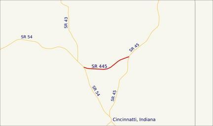 | Keywords: Map of Indiana State Road 445.svg This is a map which shows the route of Indiana State Road 445 in the United States My own work using freely-available shape data and custom-written MapScript applications 2008-03-04 Omnedon Road maps of Indiana SR445 |