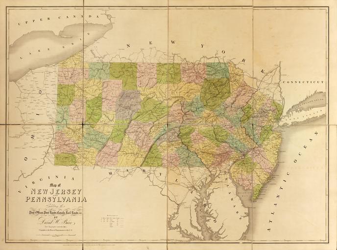 | Keywords: Map of New Jersey and Pennsylvania WDL9594.png Artwork ru Бу Дэвид Г 1803-1875 гг fr Burr David H 1803-1875 en Burr David H 1803-1875 zh 大卫·伯尔,1803-1875 年 pt Burr David H 1803-1875 ar ديفيد بور، 1803-1875 es Burr David H 1803-1875 ru Ка та штатов ью-Дже си и Пенсильвания fr Carte du New Jersey et de la Pennsylvanie en Map of New Jersey and Pennsylvania zh 新泽西州和宾夕法尼亚州 图 pt Mapa de Nova Jersey e Pensilvânia ar خريطة نيو جيرسي وبنسلفانيا ru Дэвид Г Бу 1803 1875 гг землеме и ка тог аф служил топог афом Почтового депа тамента США в 1832 1838 гг и геог афом Палаты п едставителей в 1838 1847 гг Под уководством гене ального почтмейсте а Бу соби ал от почтмейсте ов всей ст аны инфо мацию о т анспо тных ма ш утах почтовых т актах железных до огах и каналах а также о асположении почтовых отделений с целью выпуска большого комплекта госуда ственных и егиональных ка т Опубликованный в 1839 г известной лондонской ка тог афической фи мой Джона Э оусмита <em> Аме иканский атлас </em> Бу а п едставлял под обную ка тину заселения и т анспо тных ма ш утов в Соединенных Штатах Аме ики за несколько десятилетий до Г ажданской войны Здесь п едставлена составленная Бу ом ка та штатов ью-Дже си и Пенсильвания одна из 13 ка т атласа а ка те обозначены почтовые т акты п оходящие че ез ью-Дже си и соединяющие го ода Филадельфию и ью-Йо к а также показана значимость Филадельфии как т анспо тного узла <br>Каналы; Э и озе о; Почтовые т акты; Почтовая служба; Железные до оги fr Géomètre et cartographe David H Burr 1803-1875 fut topographe au Département des Postes des États-Unis entre 1832 et 1838 puis géographe à la Chambre des représentants entre 1838 et 1847 Sous la direction du Maître des postes général Burr compila les informations fournies par les maîtres des postes à travers le pays concernant les routes routes postières chemins de fer et cours d'eau et l'emplacement des bureaux de poste afin de réaliser une importante série de cartes des États et des régions Publié en 1839 par l'éminente société cartographique de John Arrowsmith <em>L'atlas américain</em> de Burr représente de façon détaillée la répartition du peuplement et du transport aux États-Unis quelques dizaines d'années avant la guerre de Sécession La carte de Burr exposée ici représentant le New Jersey et la Pennsylvanie fait partie des 13 cartes de l'atlas Elle montre les routes postières traversant le New Jersey pour relier Philadelphie à la ville de New York et l'importance de Philadelphie en tant que centre de transport <br>Canaux; Érié lac; Routes postières; Service postal; Chemins de fer en David H Burr 1803 75 was a surveyor and cartographer who served as topographer to the United States Post Office Department in 1832 38 and as geographer to the House of Representatives in 1838 47 Under the direction of the postmaster general Burr compiled information from postmasters throughout the country about transportation routes post roads railroads and canals and the location of post offices to produce a large set of state and regional maps Published in 1839 by the prominent London mapmaking firm of John Arrowsmith Burr s <em>The American Atlas</em> offers a detailed picture of settlement and transportation patterns in the United States in the decades before the Civil War Shown here is Burr s map of New Jersey and Pennsylvania one of 13 maps in the atlas The map shows the post roads through New Jersey linking Philadelphia and New York City and the importance of Philadelphia as a transport hub <br>Canals; Erie Lake; Post roads; Postal service; Railroads zh 大卫·伯尔(David H Burr,1803-1875 年)是 位测量员和制图员,于 1832 1838 年担任美国邮政署 形学 ,1838 1847 年担任众议院 理学家 邮政署长的指导下,伯尔汇编了全国各 邮政 长提供的 关运输路线(邮路 铁路和运河)以及邮 位置的信息,制 了大量州 图和 区 图 伯尔的 美国 图册 由伦敦著名制图商约翰·阿罗史密斯 John Arrowsmith 于 1839 年出版,详细描绘了美国 内战前数十年的聚居和运输模式 这里展示的是伯尔绘制的新泽西州和宾夕法尼亚州 图,是 图册中的 13 幅 图之 图显示了 经新泽西州连接费城和纽约市的邮路,以及费城 为交 枢纽的重要 <br>运河; 伊利湖; 邮路; 邮政 务; 铁路 pt David H Burr 1803-1875 foi um agrimensor e cartógrafo que atuou como topógrafo para o Departamento de Correios dos Estados Unidos entre 1832 e 1838 e como geógrafo para a Câmara dos Representantes entre 1838 e 1847 Sob a direção do reponsável geral dos correios Burr compilou informações dos responsáveis dos correios em todo o país sobre rotas de transporte estradas de correios ferrovias e canais e o local dos postos de correios para a produção de um grande conjunto de mapas estaduais e regionais Publicado em 1839 pela proeminente empresa de cartografia londrina de John Arrowsmith <em>O atlas americano</em> de Burr fornece um quadro detalhado da disposição das colônias e do transporte nos Estados Unidos nas décadas anteriores à G