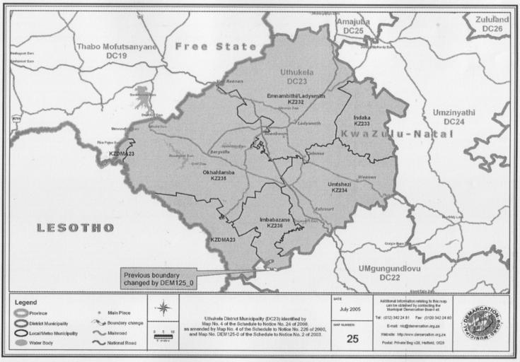 | Keywords: Map No. 25 of Schedule 2 to Notice 1998 of 2005.png Notice 1998 of 2005 Depicts the boundaries of the Uthukela District Municipality File Notice 1998 of 2005 djvu Municipal Demarcation Board of South Africa 2005-10-31 PD-South-Africa-exempt Maps of KwaZulu-Natal municipalities with 2006 borders Notice 1998 of 2005 |